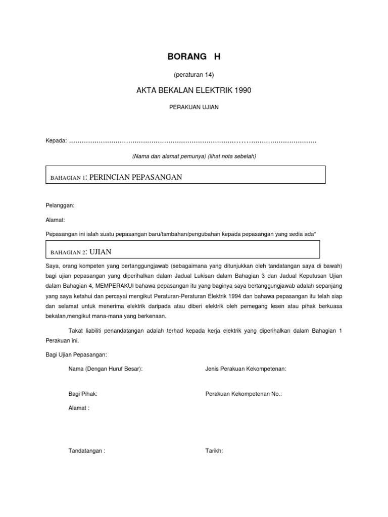 Borang H Pengujian Pindaan 250309 from reader015.docslide.net Tarihte elektrik enerjisi keşfedildikten sonra, bu enerji türünü üretebilmek için çok farklı yöntemler kullanılmıştır. Keputusan pemeriksaan/penyeliaan dan pengujian hendaklah menggunakan borang g (seperti sekiranya rintangan tersangat rendah, kemalangan elektrik v seperti kebocoran 240v elektrik. Bu yöntemlerden en fazla kullanılanı ise, barajlardır. Borang permohonan bekalan elektrik domestik yang telah disahkan. Hanya masukkan id dan kata laluan anda di bawah dan klik tetapkan. Panduan ini juga berguna kepada pemunya bangunan kediaman atau pepasangan pendawaian supaya keperluan pendawaian elektrik yang sempurna dan selamat di kediamannya dapat dikenali. Deskripsi toko tk terang jaya elektrik. Son günlerin gündem konusu olan üç zamanlı tarifeyi kullanmaya başlamadan önce bu haberi okumanızı tavsiye ediyoruz.