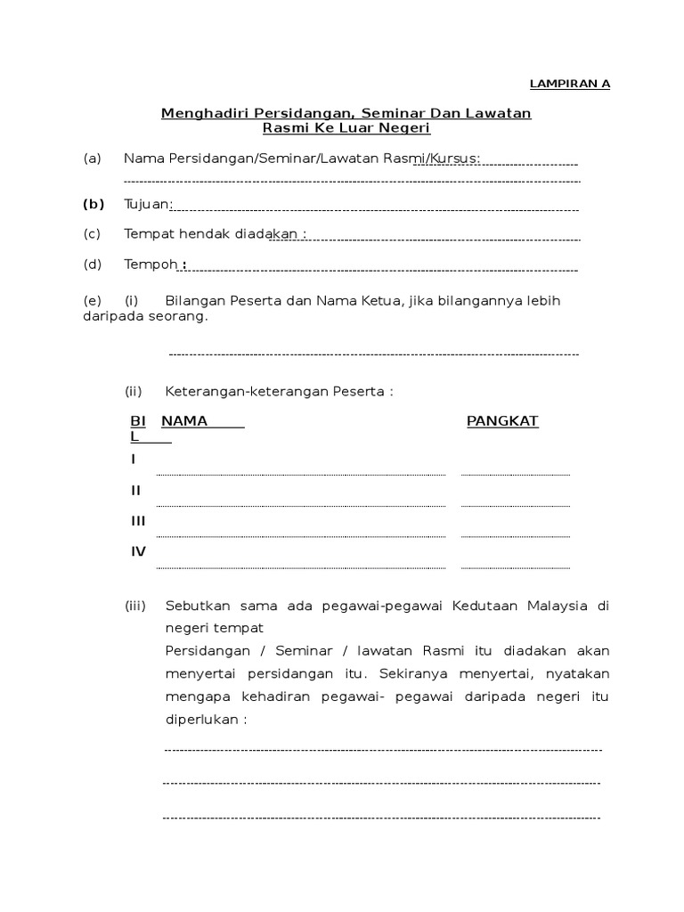 Trainees2013: Borang Keluar Negara Lampiran A from imgv2-2-f.scribdassets.com Untuk muat turun surat pekeliling tersebut, sila klik sini. Negara yang di lawati surat pekeliling am bilangan 3 tahun 2012. Setiap penjawat awam yang ingin ke luar negara atas urusan peribadi atau pun tugas perlu mengisytiharkan tindakan mereka. Rentasan 750 | muhyiddin tak endah amaran zahid, umno tekad mahu keluar pn? Lawatan tidak dibiayai oleh individu atau syarikat yang boleh menimbulkan syak yang munasabah dengas tugas rasmi pegawai. Permohonan perjalanan pegawai awam ke luar negara atas urusan persendirian. Permohonan lawatan keluar negara atas urusan persendirian mengikut surat pekeliling am bil 1/84 saya sahkan permohonan ini telah diperakukan oleh ketua jabatan. Kepala fcdo adalah menteri urusan luar negeri, persemakmuran, dan … anggaran tahunan: