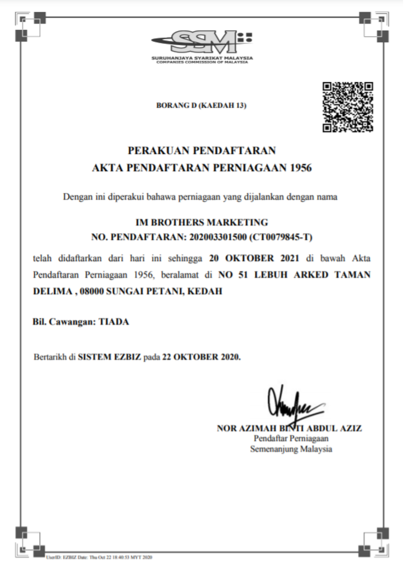 Perakuan pendaftaran perniagaan dapat diterima dalam tempoh sejam (1) jam dari waktu pembayaran dilakukan. Mendapatkan borang d, iaitu sijil perakuan. 4 set lakaran pelan lokasi perniagaan & 4 set gambar berwarna premis (1set mempunyai c) perusahaan/perindustrian/perkilangan i. Membuat bayaran sebanyak rm30 jika menggunakan nama tred dan rm60 sekiranya menggunakan nama sendiri 5. Badan berkanun dan pihak berkuasa tempatan, perwakilan dan kedutaan perlu.