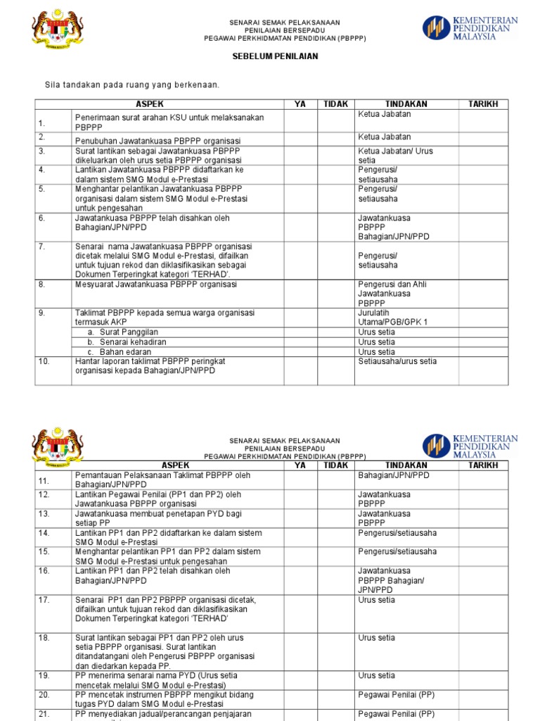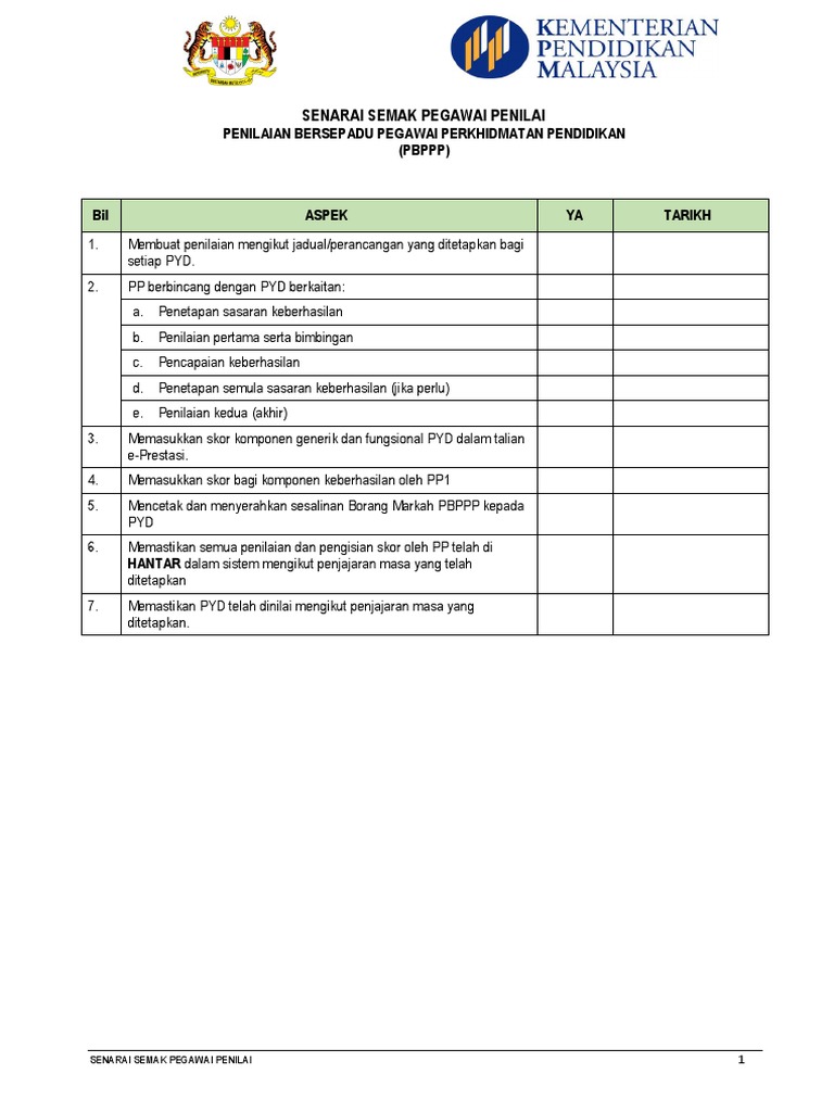 .pbppp 1 senarai semak fail pengurusan pbppp penilaian bersepadu pegawai perkhidmatan pendidikan (pbppp) bil perkara ya catatan 1.… salinan diberikan kepada agensi yang menyelia 8. Borang pemantauan pbppp oleh bahagian/jpn/ppd (jika ada). Senarai semak salinan (sila tandakan x): Skim bencana kerja pekerja asing. 1/13 panduan mengisi borang senarai semak pematuhan kendiri.
