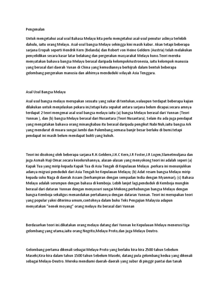 Mereka masih menyebut diri sebagai bangsa melayu (isjoni, orang melayu di zaman yang berubah, hlm. Tenyata bangsa melayu telah lama mendiami tanah melayu. Tentang asal usul orang melayu pula, terdapat kontroversi dan kekeliruan yang lebih besar dalam kalangan para sarjana. Namun, ada teori terbaharu yang menyatakan tempat asal orang melayu ialah pulau borneo, dan mereka telah merebak dari situ dalam tiga. Bersahadat bermakna orang melayu disebut melayu jika sudah mengucap kalimat syahadat, yaitu mengakui allah sebagai tuhan dan muhammad sebagai rasul panutan. Asal usul nenek moyang bangsa indonesia adalah bangsa dari daratan yunan di china selatan. Asal usul melayu sebenar mengikut sejarah. Dikenali juga sebagai orang muntah lembu, orang kalur telah melalui pelbagai proses transformasi yang melihatkan perubahan fungsi dan status mereka di dalam sejarah institusi kesultanan melayu. Jadi, kesimpulannya adalah asal usul melayu sambas tidak tunggal dan tidak berasaskan keturunan, namun berasaskan kepada orang sambas yang beragama islam dan berbahasa sambas. Ia menyebut jika asal usul nenek moyang bangsa indonesia berasal dari semenanjung asia tenggara. Konon kabarnya, pada zaman dahulu kala. Tak kira apa perkara sekalipun di dalam dunia ini, ia semestinya dimulakan dengan langkah pertama. Sejarah awal nama malayu berasal dari kerajaan malayu yang pernah ada di kawasan sungai batang hari, jambi.