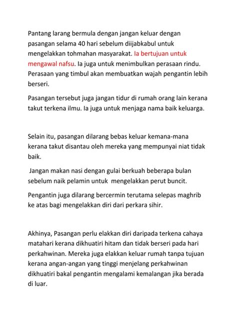Aspek perkahwinan selepas bertunang , bakal pengantin lelaki tidak boleh pergi atau keluar jauh dari rumah dibimbangi berlaku kemalangan. Kebanyakan pantang larang diturunkan secara lisan turun kemurun. Malaysia kaya dengan pelbagai kaum. Pantang larang kaum melayu, cina dan india. Perkahwinan kaum india di malaysia diklasifikasikan kepada beberapa jenis iaitu tamil tirumanam, eliyat tirumanam dan vaitiikat tirumanam. Antara pantang larang yang selalu dititik beratkan adalah pantang larang perkahwinan dan pantang larang perayaan. A) selepas bertunang bakal pengantin lelaki tidak boleh pergi atau keluar jauh dari rumah kerana dibimbangi berlaku kemalangan. Pantang larang semasa merisik adalah bakal pasangan akan saling membalas kunjungan ketika merisik. Pantang larang kaum cina menjelang tahun baru. Kaum melayu dengan pantang larang memang tak dapat dipisahkan. Warisan dan peninggalan nenek moyang mereka ini ada yang masih lagi sesuai dan ada yang sudah tidak relevan dengan zaman moden ini. Alex chin 2 years ago. Kaskhat kks 4 years ago.